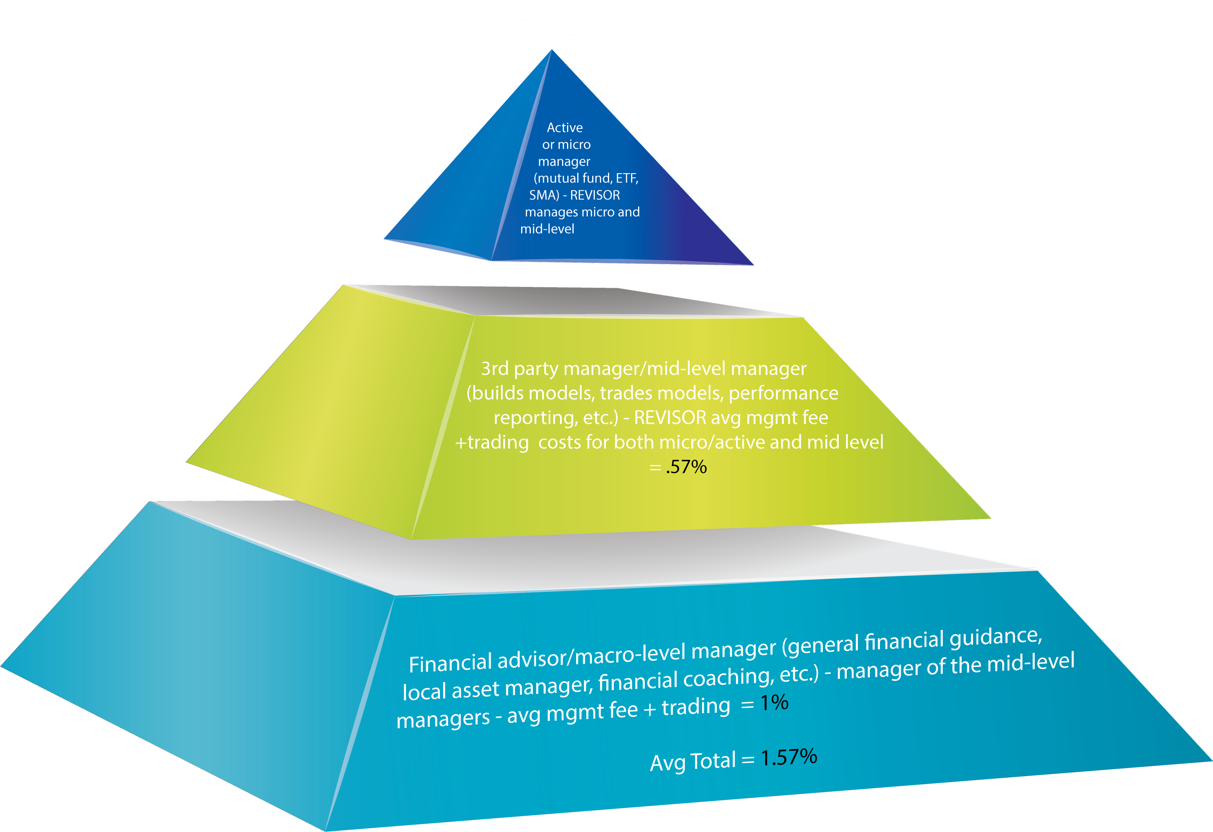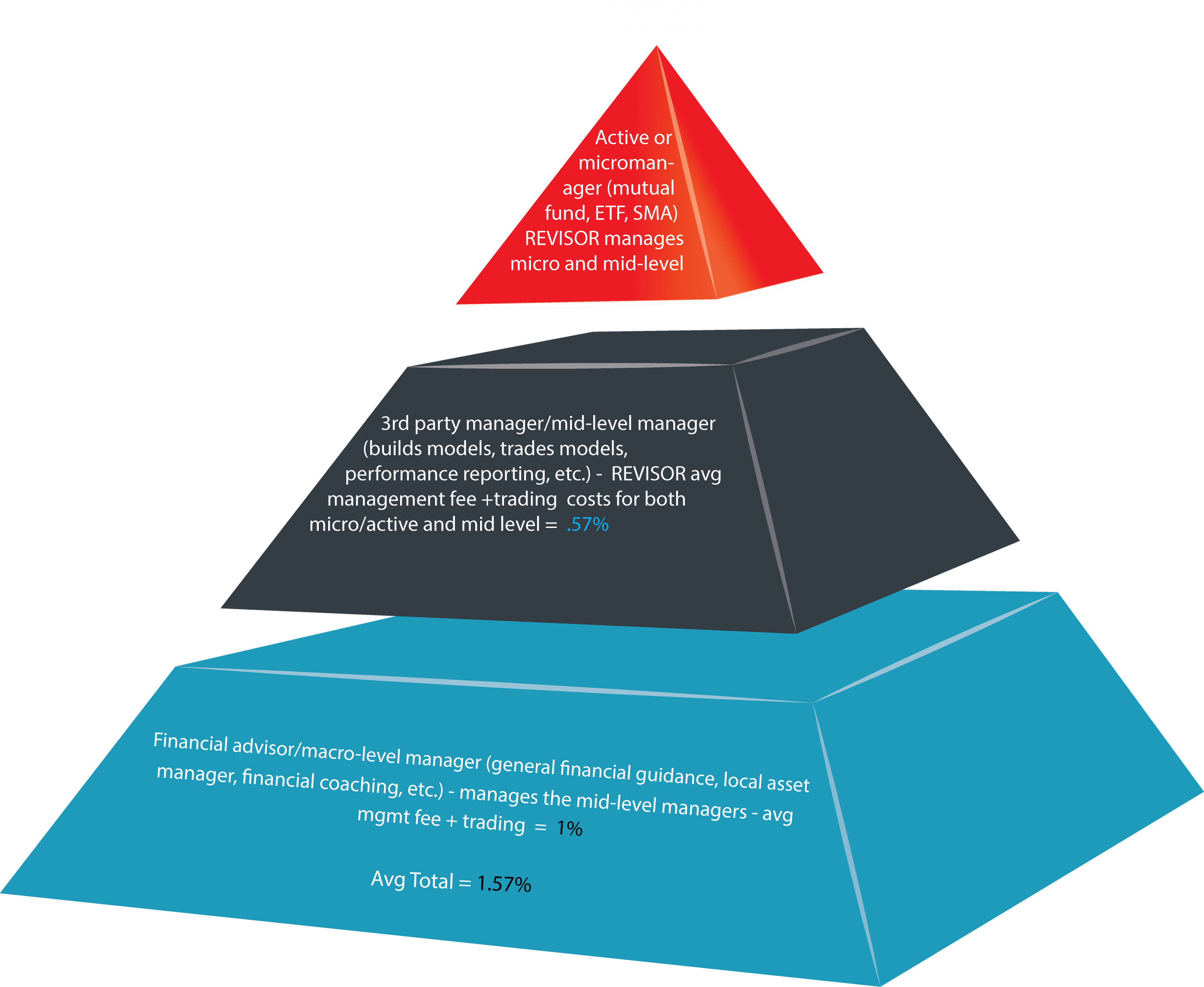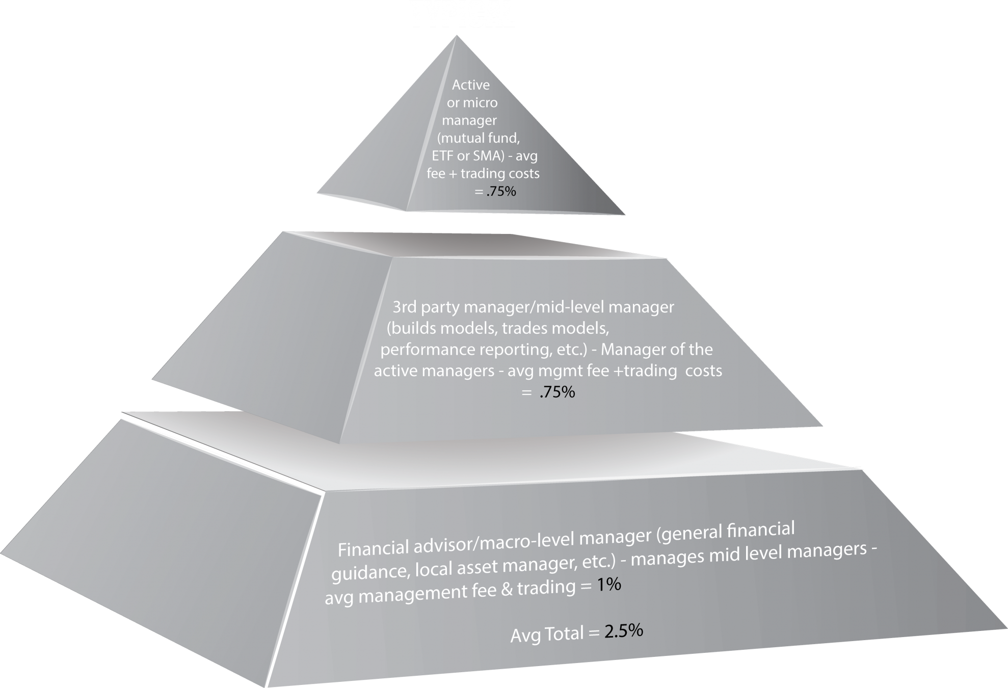 Our research shows that third-party model managers charge an average fee of 45 bps and the average advisor can operate the investment management process internally for approximately 25 bps. The pricing for investment outsourcing services simply had to come down to 25 bps or lower. In order to make this a reality we built an innovative process and distribution system that eliminates layers of management fees and trading expenses. We call this revolutionary platform Smart Models TM We believe that this is the first step in pushing the industry forward and promoting additional innovation. Take a look below at the typical 3 layered model management structure (micro, mid-level, and macro) vs. our revised process.